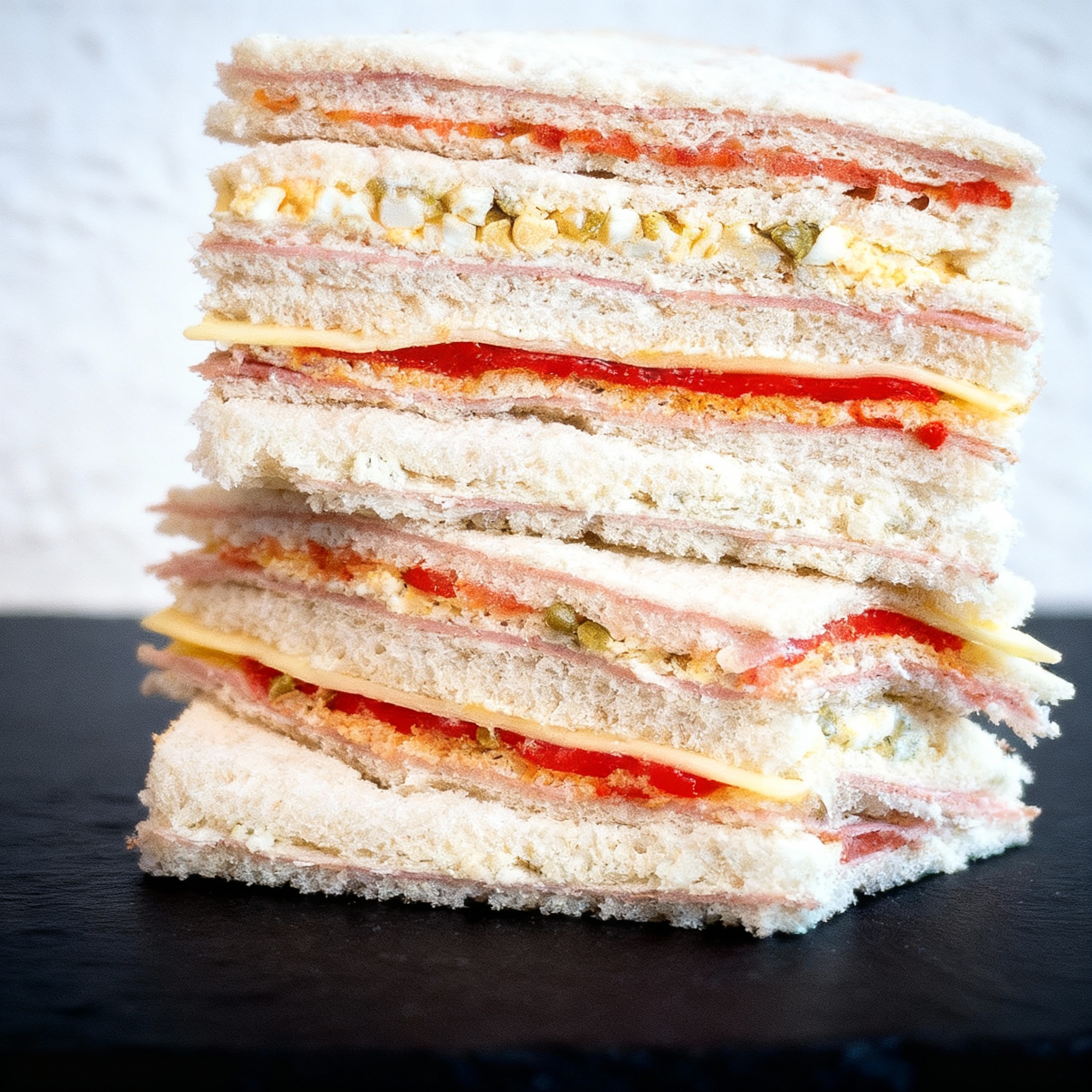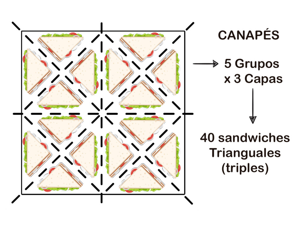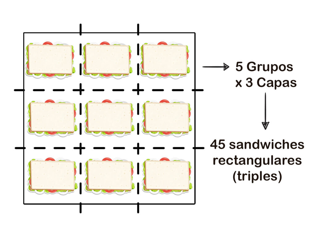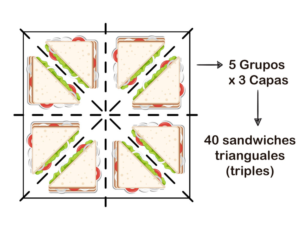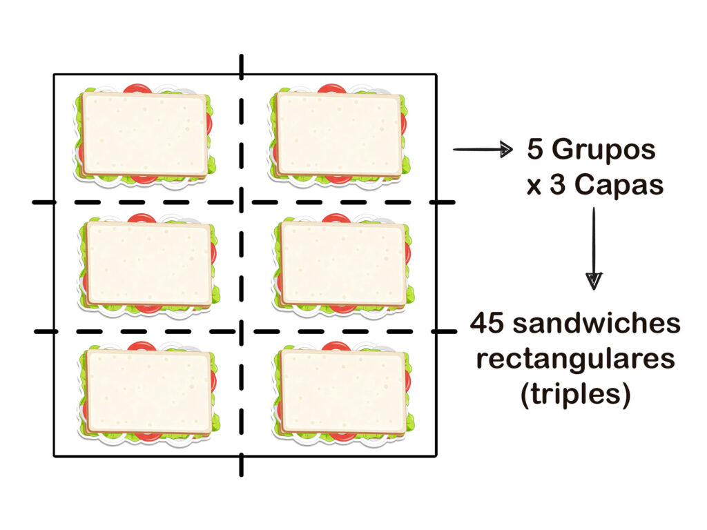 Una vez formados los bloques de sándwiches triples, puedes cortarlos de diferentes formas según la cantidad que necesites: